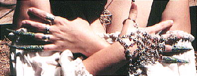 Here (in the photo, right), the Lady Regina shows off her jewelry while sitting for another portrait in the courtyard of (appropriately enough!) "Charon's Crossing". Her many rings, finger caps and "slave" bracelet (detailed in the photo, below) excited considerable comments--and compliments!--from both players and other patrons alike. After we closed down the faire Saturday night, these two invited Mike and I to their tent in the patron campground to enjoy a late meal of homemade pepper sausage, onions and bell peppers with Chris acting as chef. Our especial thanks to both of them not only for their friendship but also for a most excellent and hearty repast, with Hawkwood wrapped around it!